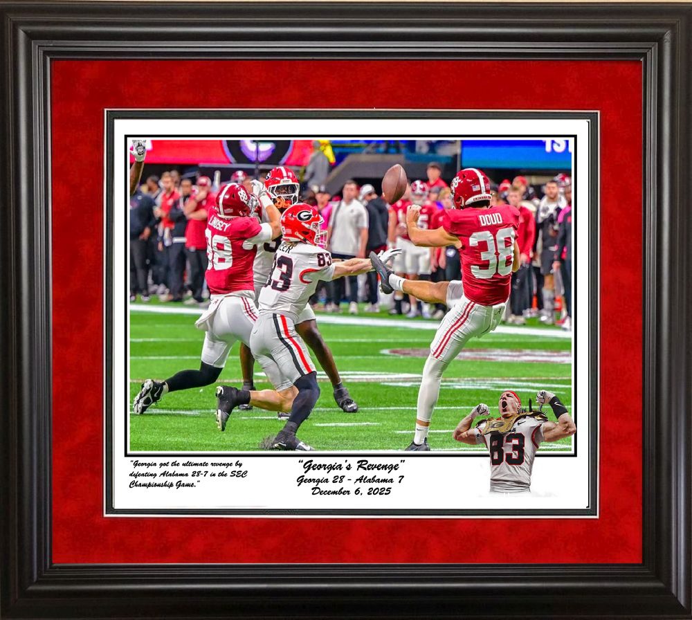 Georgia’s Cole Speer blocked an Alabama punt, leading to an early touchdown drive and a 7-0 lead and basically set the tone for this dominating victory. This limited edition framed print celebrates that historic play and is entitled,